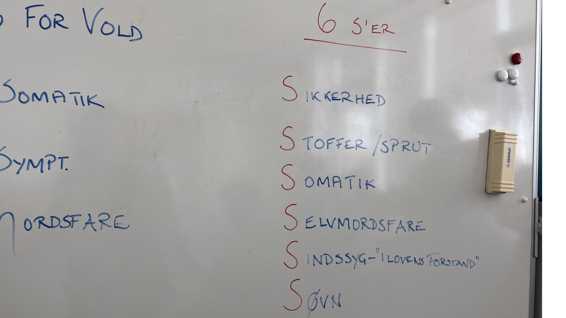 De 6 S’er: Sikkerhed, Sprut/Stoffer, Somatisk, Selvmordsfare, Sindsyg – i lovens forstand, Søvn. Seks parametre den akutte psykiatriske patienter kan vurderes ud fra.