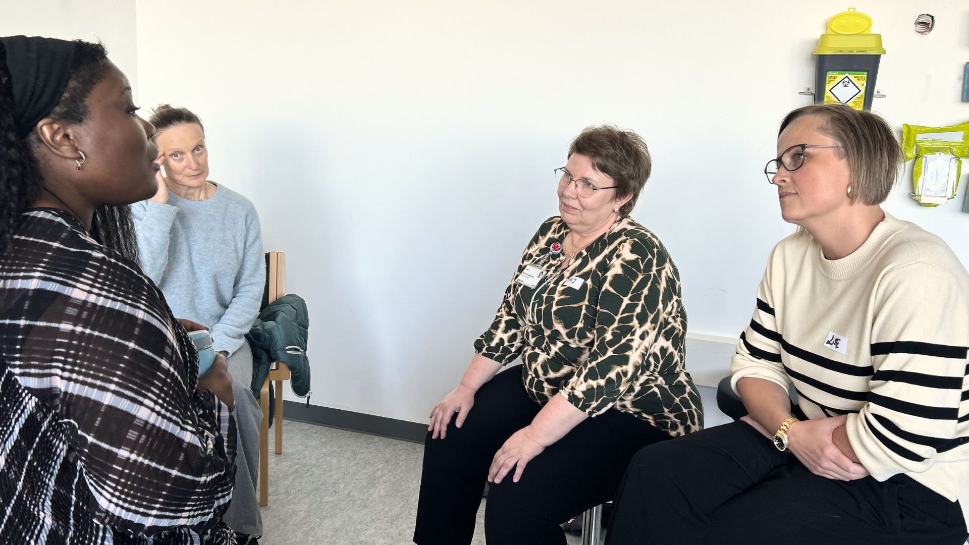 Eva Byakika (forrest til venstre) fra Center for Kompetenceudvikling faciliterer undervisningen og den virkelighedsnære træning. Med sig har hun Kjersti (bagerst til venstre), der er skuespiller. Her simulerer Maj (bagerst til højre) og Lotte (forrest til højre) mødet med en patient med akut psykose.